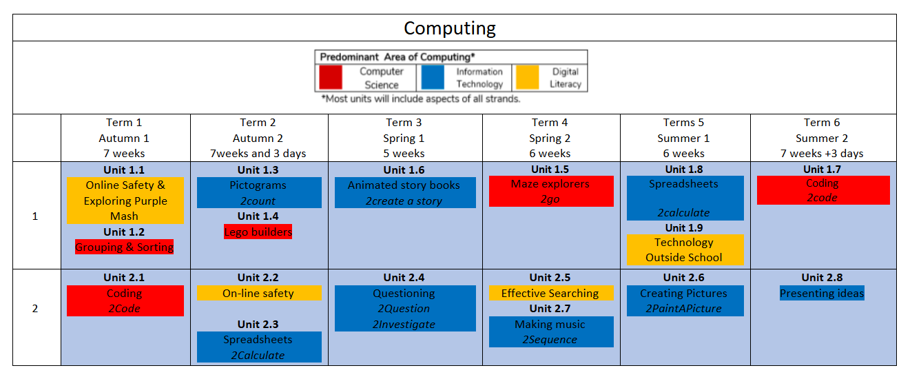 In Year 2, children develop their computing skills through engaging and interactive lessons using the Purple Mash online platform. Throughout the year, pupils learn the fundamentals of coding by creating simple programs and algorithms, understand how to stay safe online through e-safety lessons, and develop their ability to present and organise information using digital tools. They explore spreadsheets, create digital artwork, and practise word processing skills to support their learning across the curriculum. Using Purple Mash helps children build confidence in navigating technology responsibly, creatively and independently, preparing them for the wider digital world.